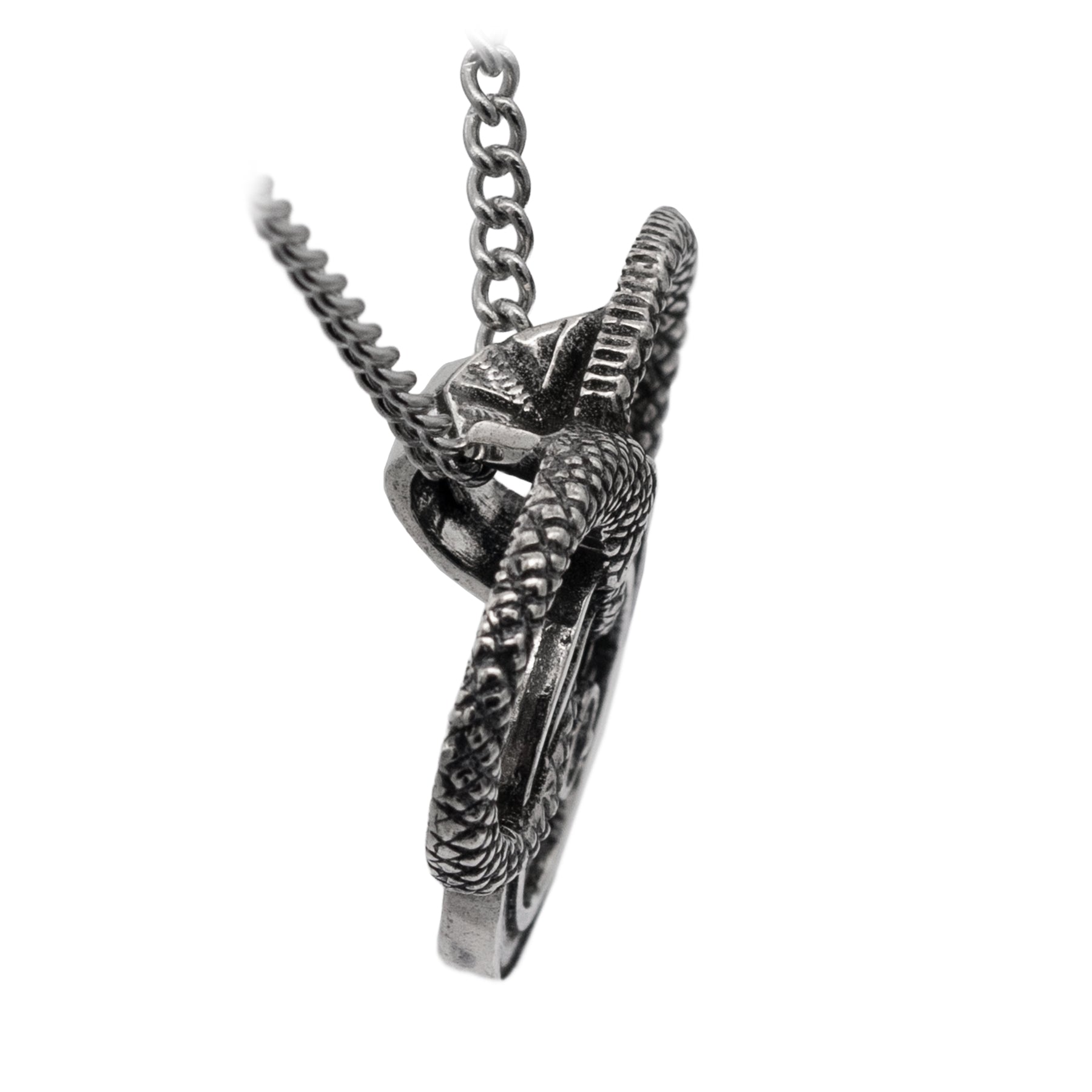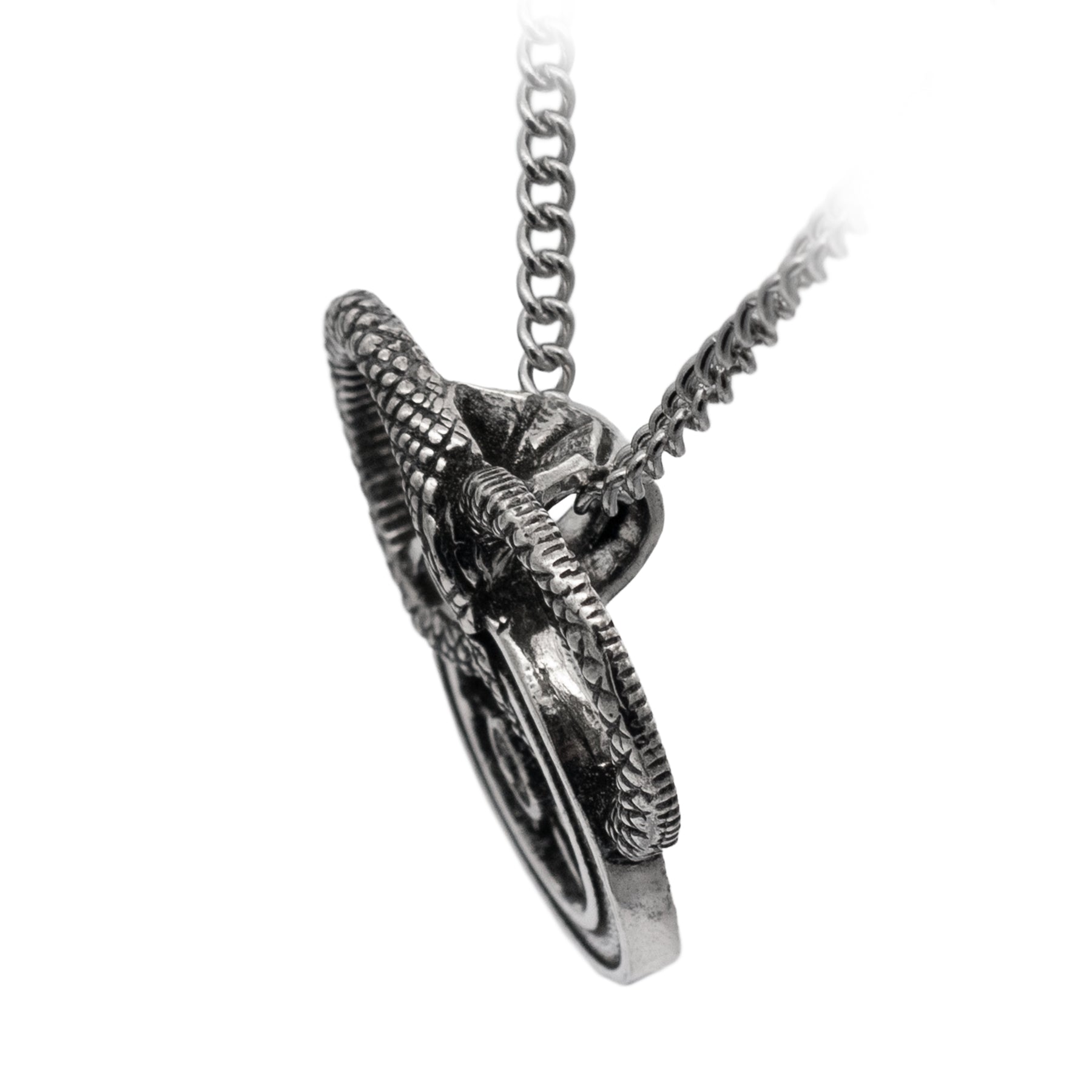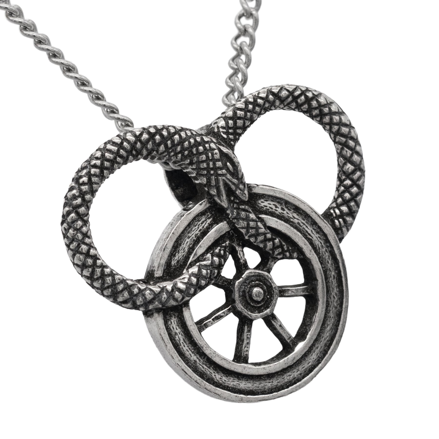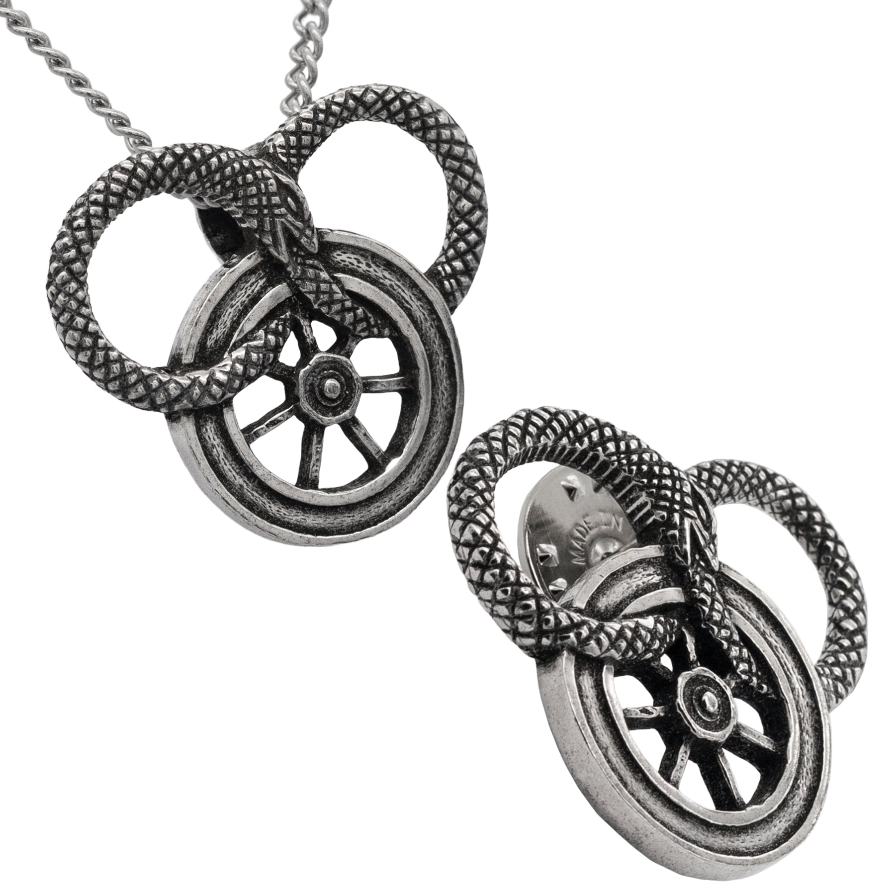 Dimensions: The Snake and Wheel Necklace measures 25.16 mm long, 28.49 mm at the widest point, and 3.34 mm at its thinnest and 8.76 mm at its thickest.